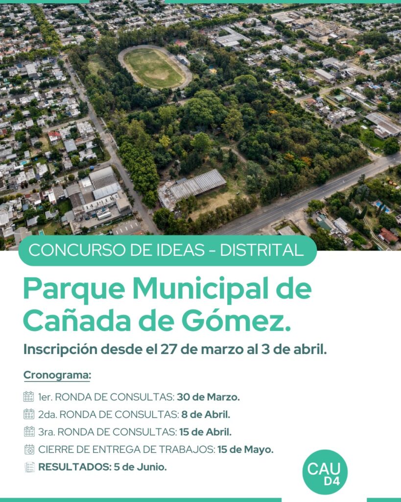 La Municipalidad de Cañada de Gómez, junto al Colegio de Arquitectura y Urbanismo de la Provincia de Santa Fe – Distrito 4 (Casilda), convoca a participar del Concurso Distrital de Ideas para la refuncionalización general y rediseño de sectores del Parque Municipal “Juan Domingo Perón”.