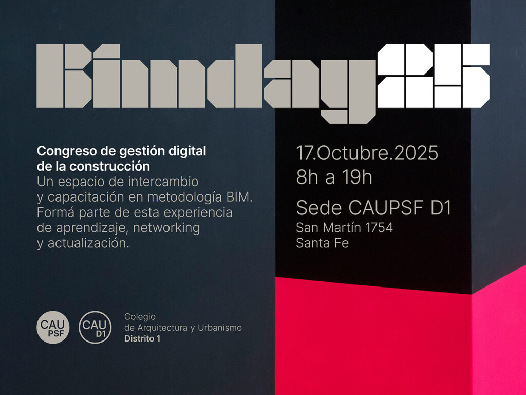 Recordamos que el próximo 17 de octubre de 8 a 19 hs. se llevará a cabo en la sede del CAUD1-Santa Fe (San Martín 1754) la tercera edición de “BIMday 2025: Congreso de Gestión Digital de la Construcción” y que el Colegio invita a participar, sin costo alguno para los y las matriculados/as, de este evento que reúne a toda la industria de la Arquitectura, Ingeniería, Construcción y Operaciones para compartir experiencias, tendencias y oportunidades en torno a la digitalización de los procesos constructivos.