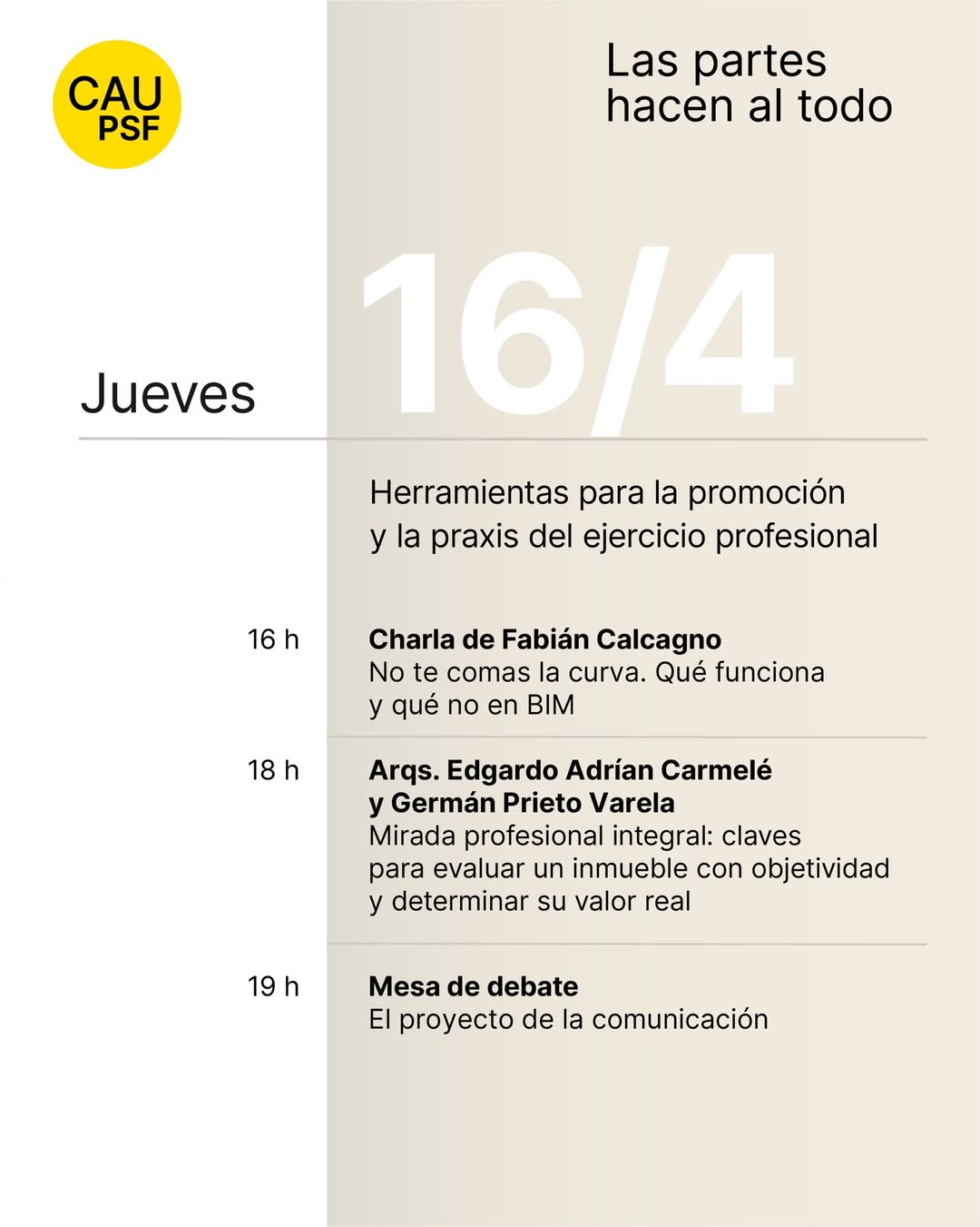 Luego, a las 18 h, se realizará la charla “Mirada profesional integral: claves para evaluar un inmueble con objetividad y determinar su valor real”, organizada por la Comisión de Pericias y Tasaciones CAUPSF D1. La actividad propondrá herramientas para comprender cómo una evaluación técnica puede incidir en la determinación del valor de mercado de un inmueble, detectar riesgos y aportar mayor respaldo a las decisiones de compra, venta o inversión.