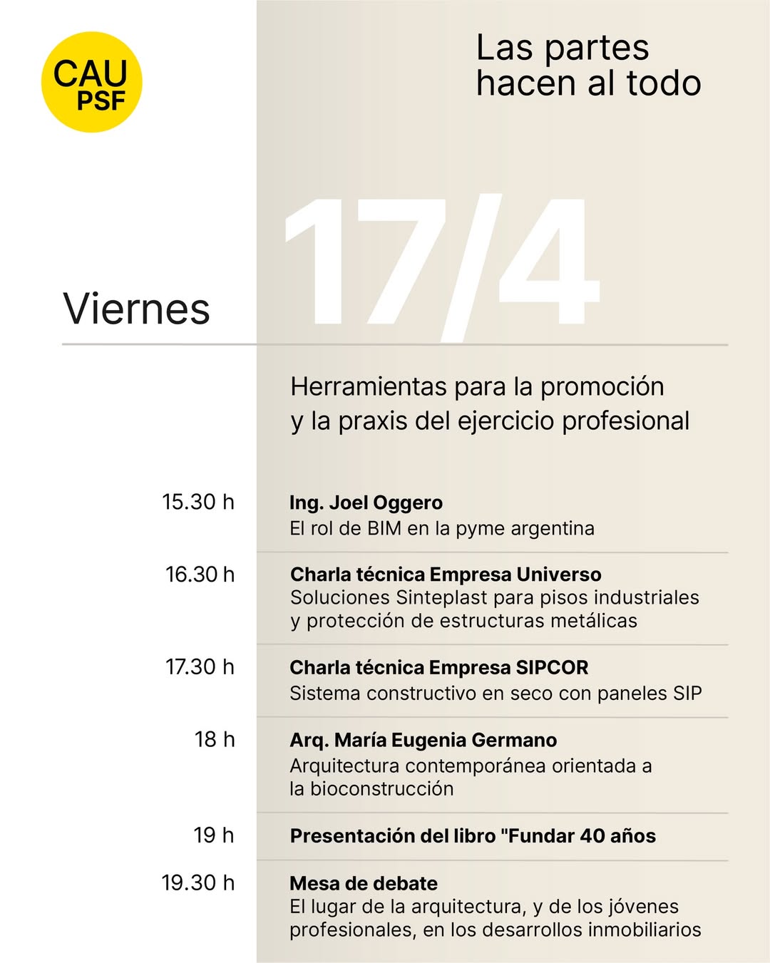 El programa se encuentra en construcción y continuará sumando propuestas en articulación con comisiones, distritos y empresas. En esta primera difusión, el CAUPSF comparte algunas de las actividades ya confirmadas, que se desarrollarán en su espacio dentro de la feria.