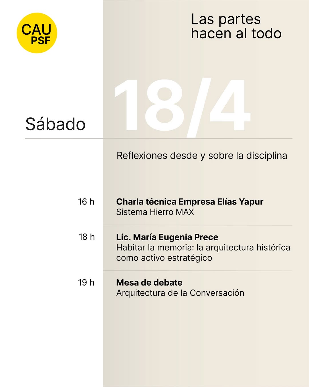 Además a las 19 h se desarrollará el conversatorio “Arquitectura de la Conversación”, organizado por el CAUPSF DSP y moderado por Federico Fritschi. Participarán Marcos Zampieron, María Eugenia Prece, Federico Cairoli, María Laura Bertuzzi y Luis Muller, referentes con trayectorias diversas y complementarias en arquitectura, patrimonio, historia urbana, fotografía, investigación y producción editorial.