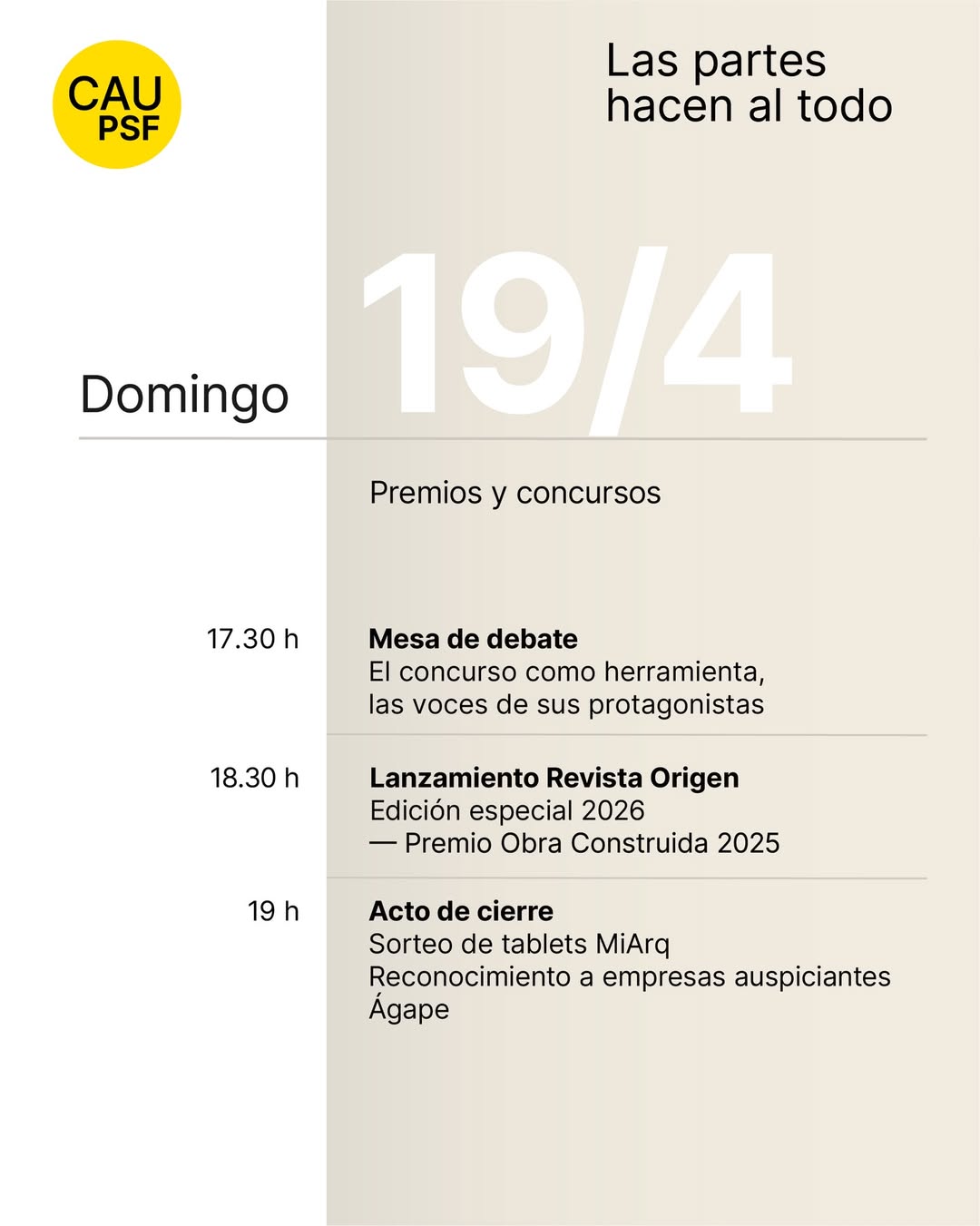 Luego, a las 18.30 h, se realizará el lanzamiento de la Revista Origen – edición especial 2026 Premio Obra Construida 2025.